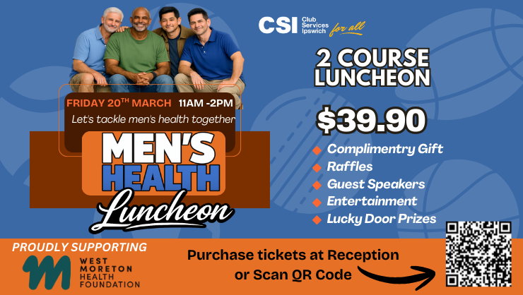 Club Services Ipswich 5a Lowry Street, NORTH IPSWICH, QueenslandMen’s Health Luncheon – Club Services Ipswich Join us on Friday, 20th March from 11am–2pm for a special Men’s Health Luncheon at Club Services Ipswich — an inspiring afternoon dedicated to raising awareness and support for men’s health in our community. Enjoy a delicious 2‑course lunch for just $39.90 pp, along with a vibrant program [...]